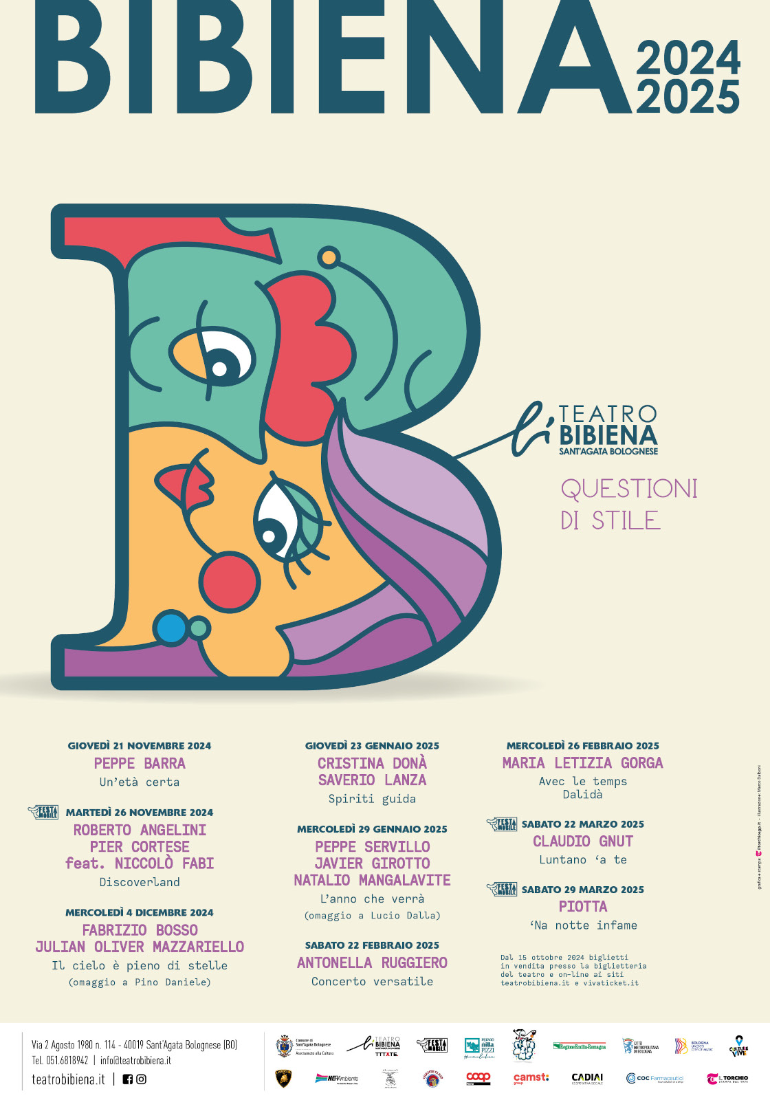 Ad aprire la stagione, patrocinata dalla Regione Emilia Romagna, sarà un mattatore delle scene, il Maestro del Teatro napoletano e italiano, PEPPE BARRA che festeggerà con poche ed esclusive date il suo ottantesimo compleanno. Lo spettacolo dal titolo “UN’ETA’ CERTA” sarà rappresentato sui più importanti palchi italiani quali Roma – Parco della Musica, Torino – Teatro Colosseo, Milano – Teatro Carcano, Firenze – Teatro Puccini per poi arrivare a S.Agata Bolognese il 21 Novembre – unica data in Emilia Romagna. A seguire il concerto DISCOVERLAND con ROBERTO ANGELINI, PIER CORTESE con la partecipazione speciale di Nicolò Fabi (26 novembre). Il 4 dicembre sarà la volta del famoso jazzista Fabrizio Bosso con il concerto “IL CIELO È PIENO DI STELLE”, omaggio a Pino Daniele. La stagione teatrale prosegue con CRISTINA DONÀ E SAVERIO LANZA in “SPIRITI GUIDA” (23 gennaio) e PEPPE SERVILLO JAVIER GIROTTO, NATALIO MANGALAVITE in ”L’ANNO CHE VERRA’” omaggio a Lucio Dalla il 29 gennaio.